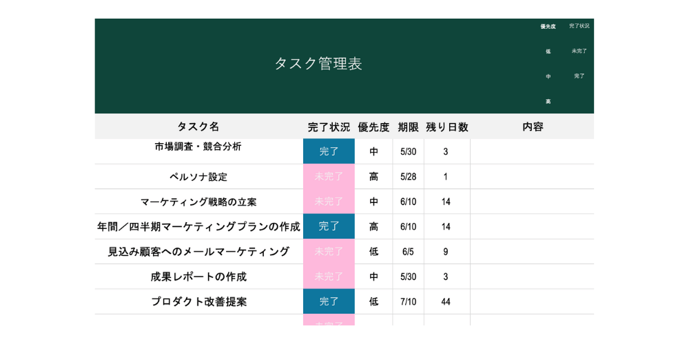 関数などを用いてカスタマイズすることで、より便利なタスク管理表を作成できます。