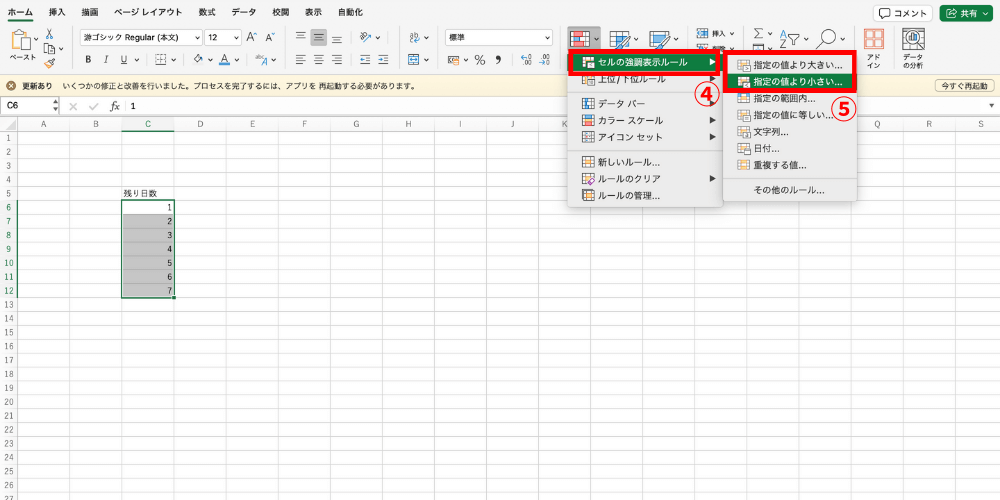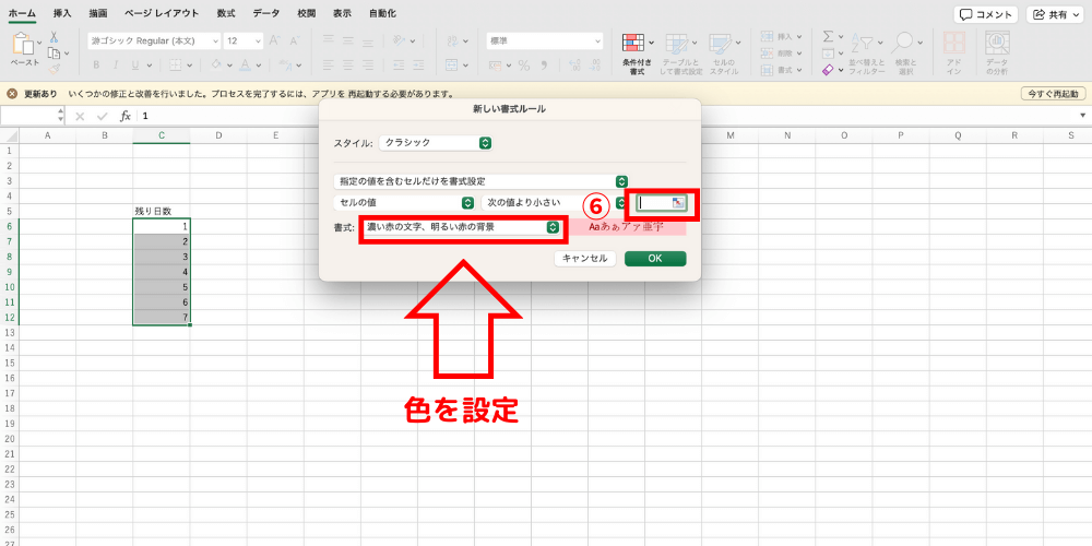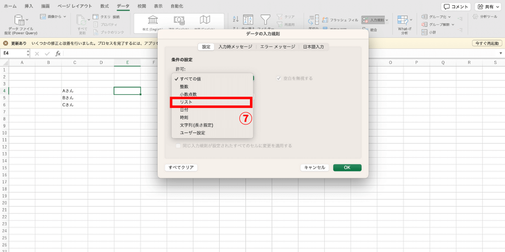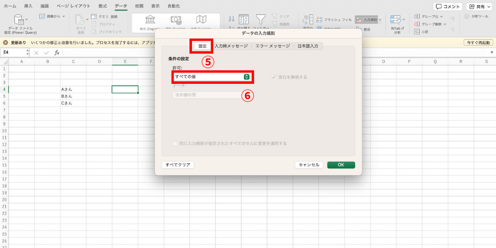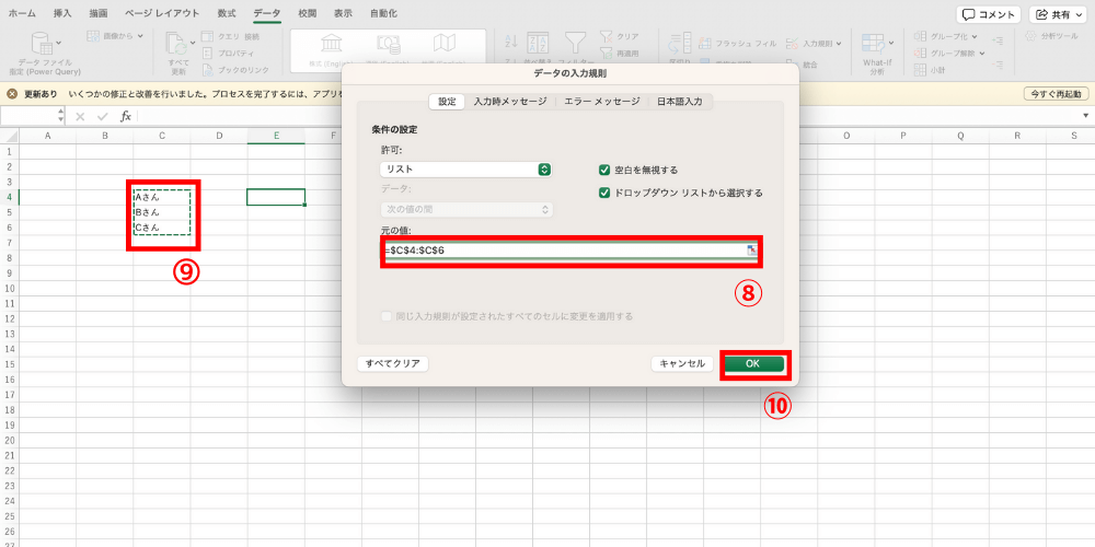 ⑥「元の値」の箇所に、①で作成したセルを選択して入力