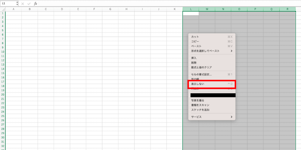 余白を消すためには、消したい範囲のセルを選択し、右クリックすることで表示される「表示しない」をクリックすることで、余白を非表示にし、消すことができます。