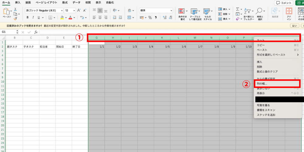 - 手順① 親タスク、子タスクを入力する列を作る(WBS部分の作成)