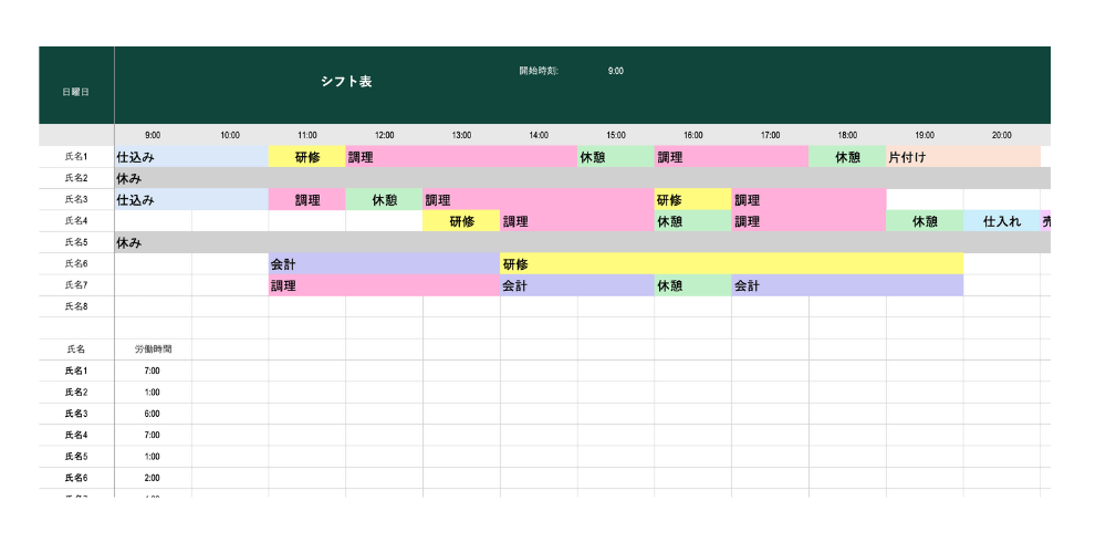 また、本テンプレートは開始時刻が9:00からになっていますが、変更する場合はH2セルにある時刻の場所を変更することで開始時刻を変更できます。