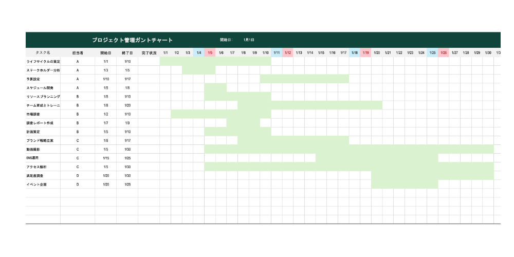 以上、複数人でのスケジュール管理表の作り方でした。次章では、個人用のタスク管理表の作り方を紹介します。