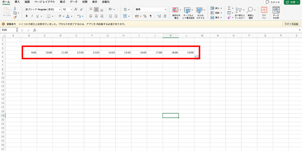 例えば、9:00から18:00までの軸が欲しいときは、I3セルに9:00、I4セルに18:00と入力します。その後、余白の行を消すことで必要な時間分だけ表示させることができます。