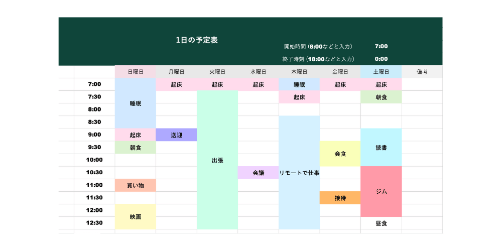 1週間の予定を曜日単位で管理できるテンプレートです。30分ごとに予定を入力できるため、細かく予定を管理したい方におすすめです。また、I3、I4セルに時間を入力することで、表示される時間を24時間まで調整できます。