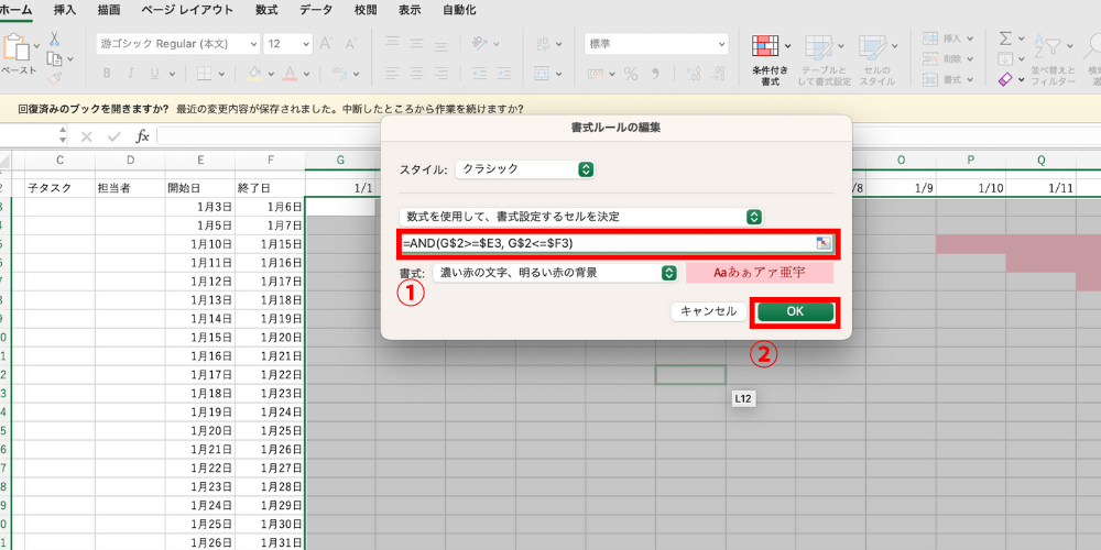 C列にタスクの開始日、D列にタスクの終了日を入力すると、開始日と終了日の日程が塗り潰されます。塗りつぶされる色を変える場合は、ホームタブの「条件付き書式」をクリックし、「ルールの管理」をクリックし内容を変更することで色を変更できるようになります。