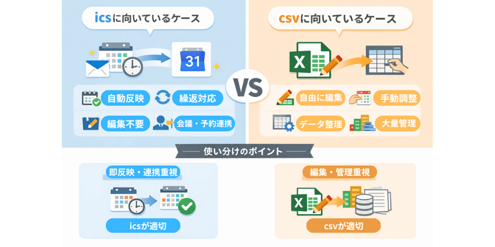 Googleカレンダーへ直接予定を反映したい場合はicsが適しています。一方、編集や加工を重視する場合はcsvが使われます。