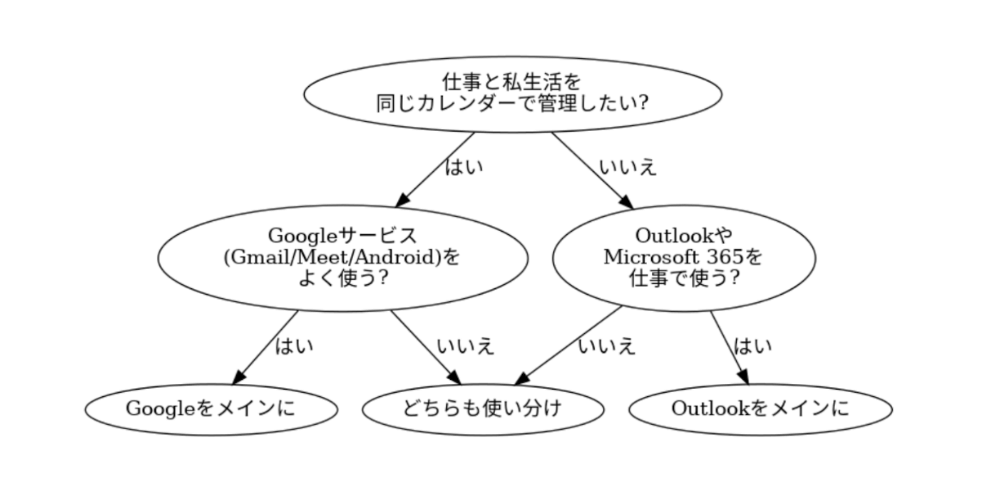 どちらをメインに使うか迷う場合は、利用環境や操作する端末、仕事と私生活の使い分け状況で判断すると方向性が決まりやすくなります。それぞれのツールには得意分野があり、用途に合わせた選び方をすることで、予定確認や共有が進めやすくなります。