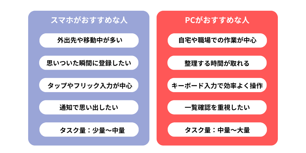 スマホは、スピード感を重視したタスク管理に向いています。移動中でもワンタップで登録できるため、メモ代わりとして使いやすい点が特徴です。