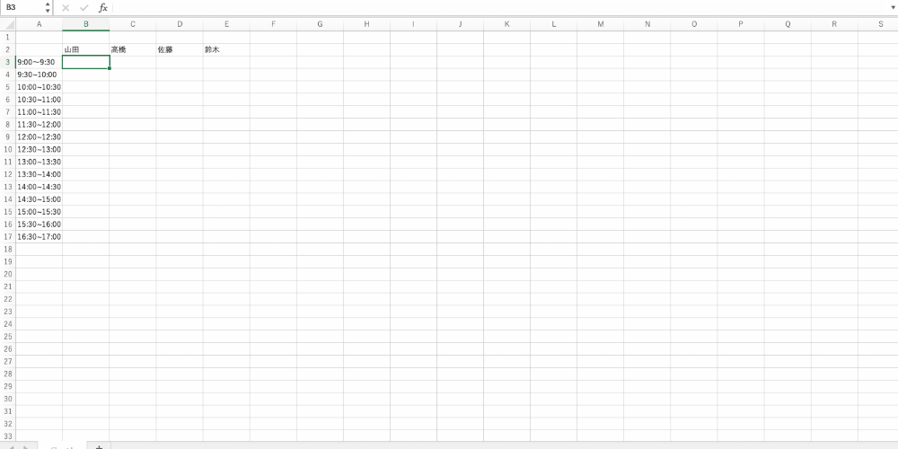 今回は4スタッフの1日分(8時から17時まで)のスケジュールを作成していきます。こちらをベースにしつつ、7日分を横に繋げることで1週間分の予定表を作成できます。ステーションの勤務時間に合わせて作ったり、時間外の稼動がある場合は多く作ったりと応用してみてください。