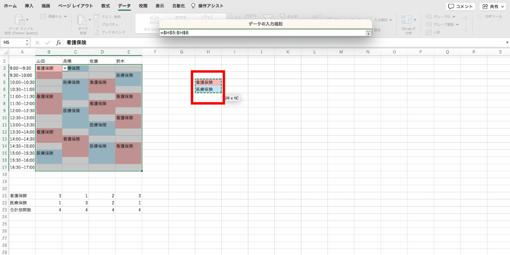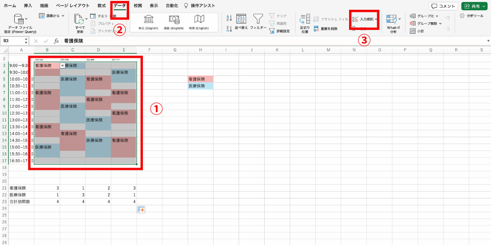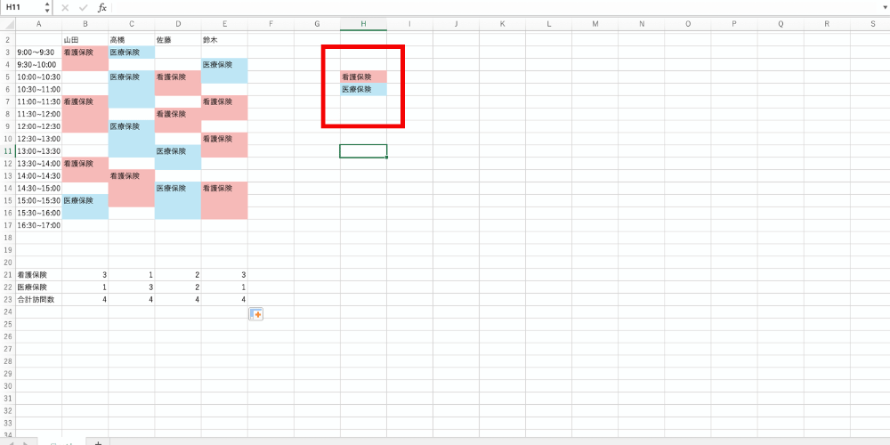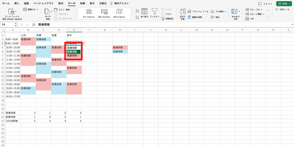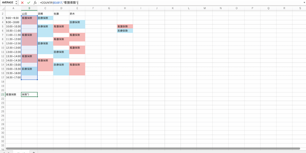 スタッフごとの看護保険の数を自動でカウントするには、看護保険の数を出力したいセルに、(=COUNTIF(B3:B17,”看護保険”)を入力します。「””」のあいだに、医療保険での訪問は「医療保険」と入力すると、B3からB17までのあいだに「医療保険」とついた個数を自動で数えてくれます。このようにして、看護保険と医療保険の数をスタッフごとに計算します。