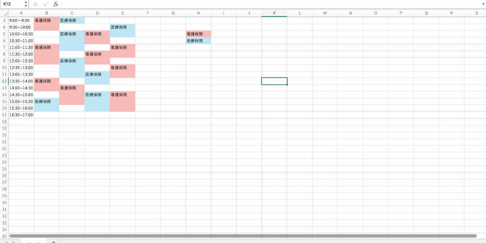 以上のように複数スタッフ・1日の予定を時間軸で作成することができます。実際の訪問看護ステーションでは、これを7日分横に並べ、1週間分で1タブとして作成するケースが多いです。