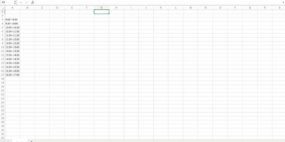 まずは1日の動きを把握するため、左の列に時間軸を作成していきます。始業時間から終業時間までの時間を記入して行きます。訪問スケジュールは30分きざみが多いため、1行につき30分の認識で作成しましょう。