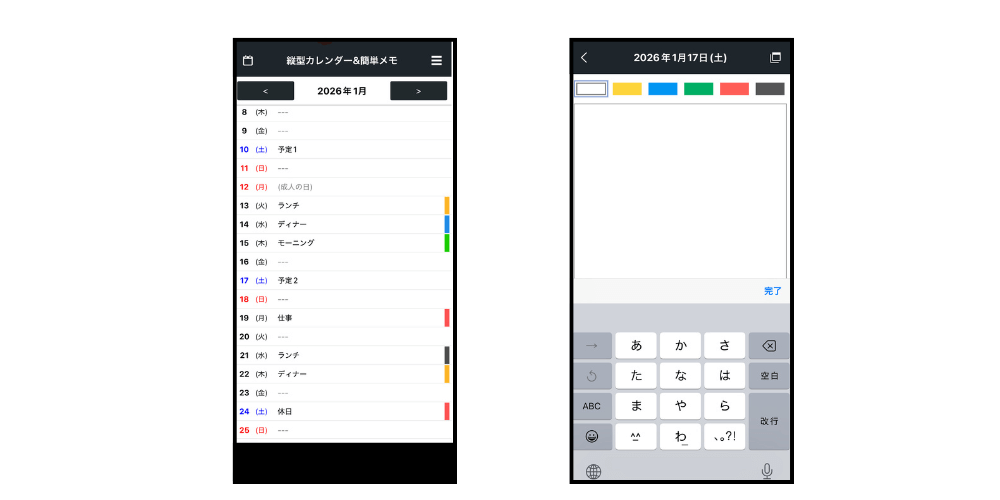 一方で、シンプルカレンダーと異なり、日記機能やメモ機能、ToDo管理が利用できます。そのため、シンプルすぎる設計では物足りないと感じる人や、仕事のToDo管理にも活用したい人におすすめです。