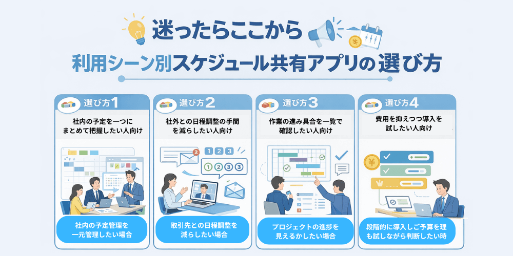 次項では、利用シーン別スケジュール共有アプリの選び方について解説します。