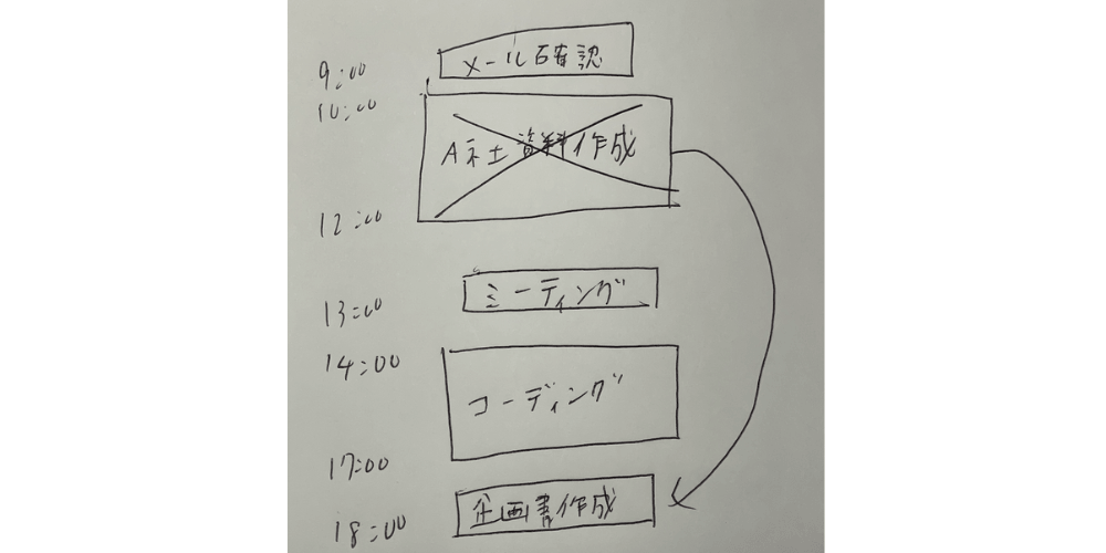 しかし、紙のタイムボックスなら、予定が変わったらぐちゃぐちゃっと二重線で消して、矢印を引っ張って空きスペースに書き直すだけです。 「完璧なスケジュール表を維持すること」を諦め、「今この瞬間の予定がざっくり分かればいい」と割り切ることで、1日の解像度が上がり、目の前のタスクに集中できるようになります。