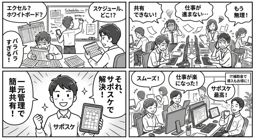 このようなお悩みは、弊社のスケジュール管理サービス「サポスケ」が解決できるかもしれません。