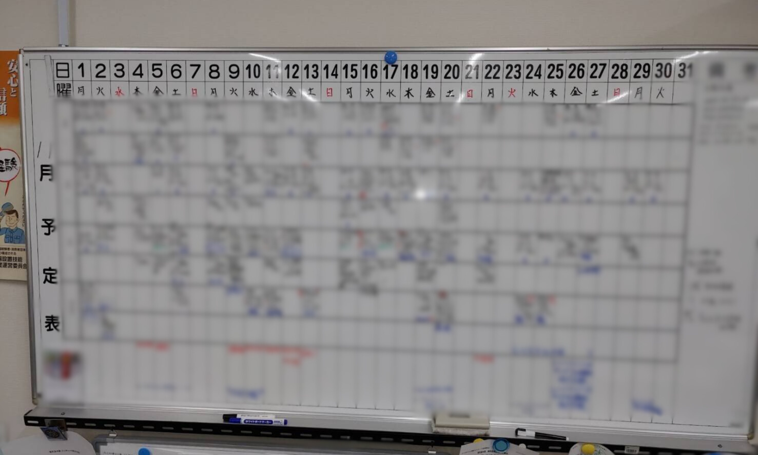 以前までは、案件のスケジュール管理をホワイトボードで行っておりました。事務所にあるホワイトボードに日付を記載し、各日付に案件と誰が入るかを記入して管理する形です。