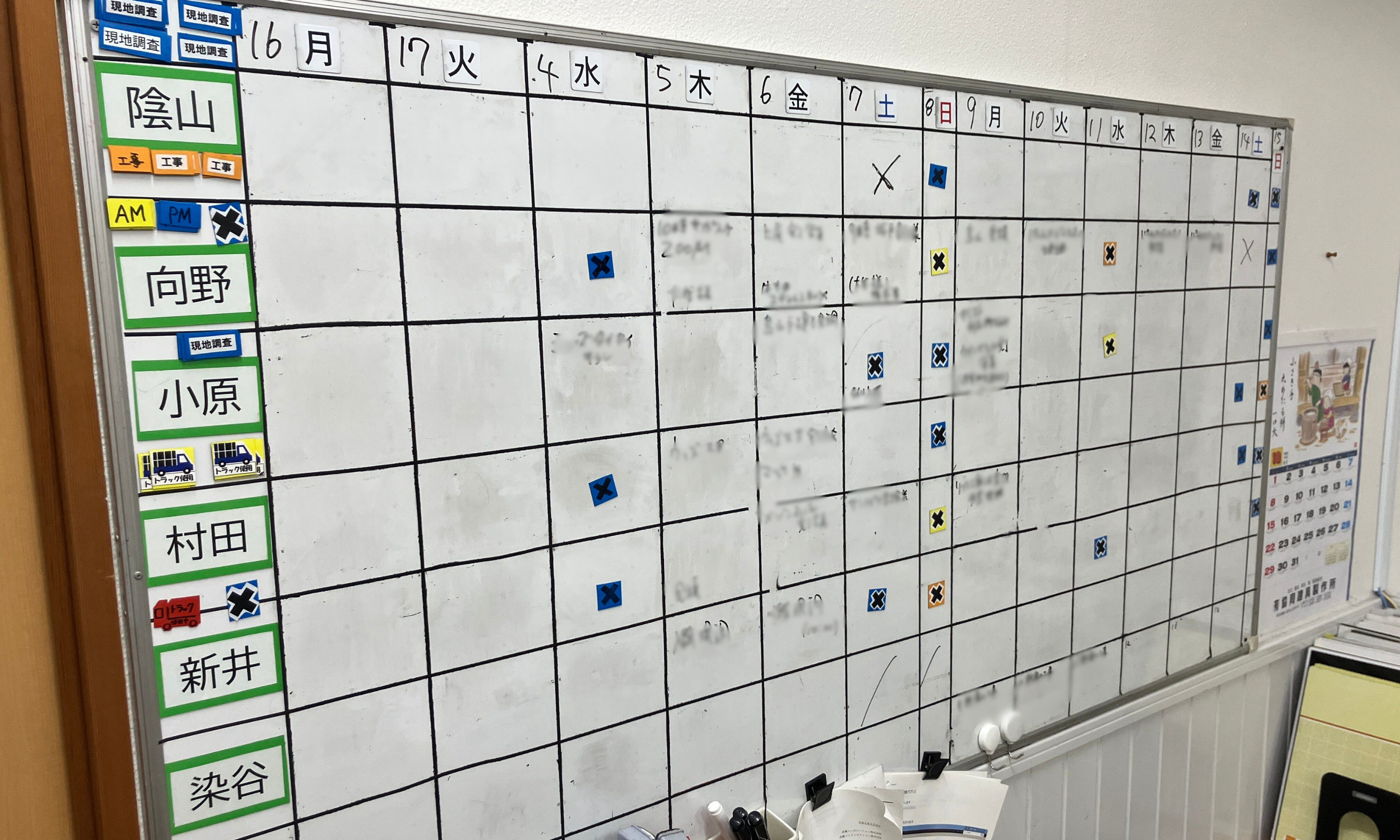 ホワイトボードを使用してスケジュール管理を行っていました。2週間単位で、縦軸にスタッフ、横軸に日付を配置し、予定を記入していました。予定の記入はスタッフ各自が行い、トラックの管理などにはマグネットを使用していました。