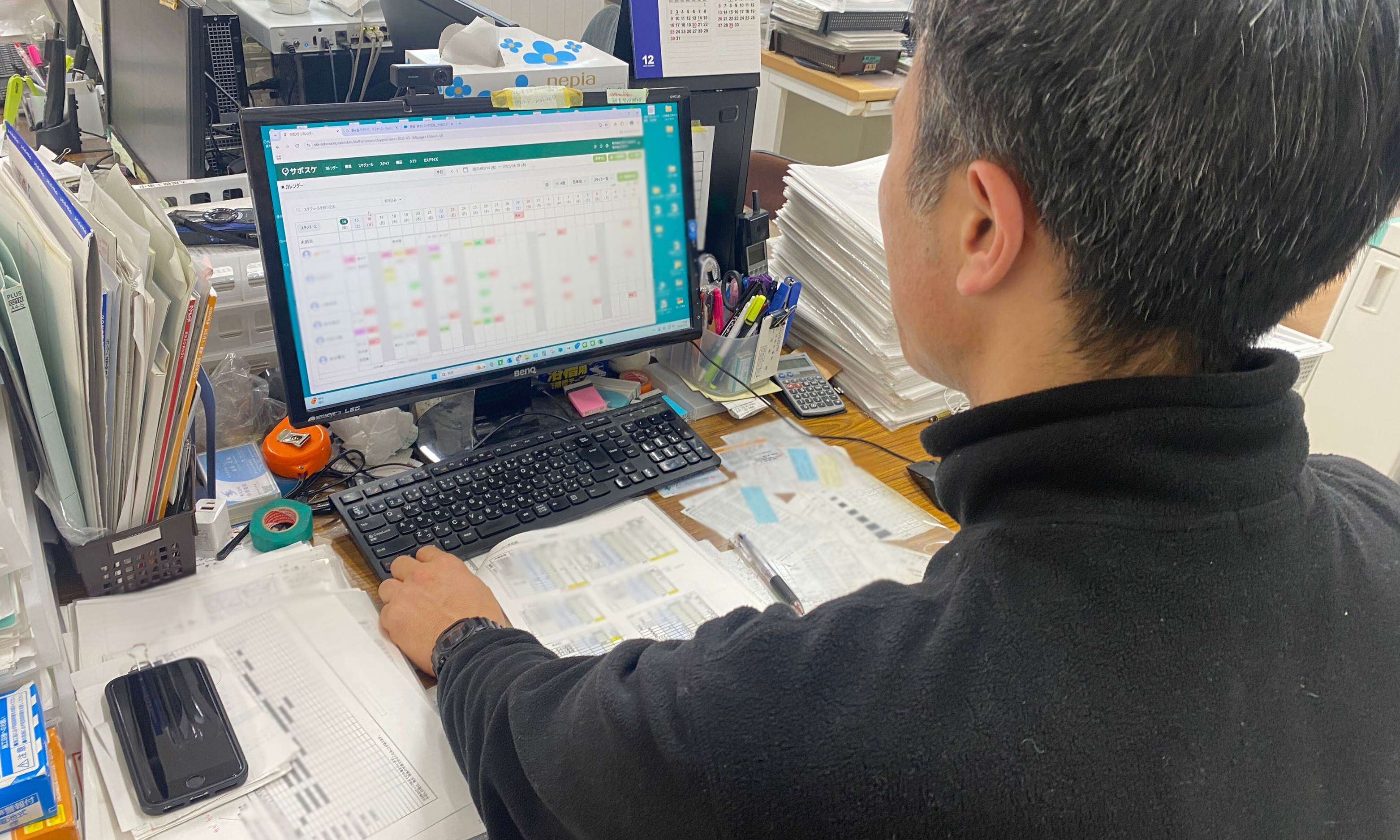 ホワイトボードが席から遠いスタッフは、わざわざホワイトボードに書きに行くのが面倒で、個々に手帳や紙でスケジュールを管理していることが多く、全員がホワイトボードを活用していなかったという問題もありました。